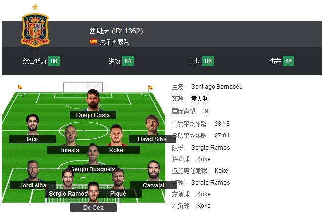 西班牙作为曾经缔造过欧洲杯——世界杯——欧洲杯三连霸伟业的传统强队,在经过14年世界杯和16年欧洲杯两届大赛新老交替的积淀后,现在的阵容配备已经相当出色,攻守平衡而且富有冲击力。除去小白和布教授的状态有所下滑,其他位置都有一到两名颇具实力的球员坐镇,23人大名单中诸多实力派球员的落选也间接证明了西班牙队的人才济济。