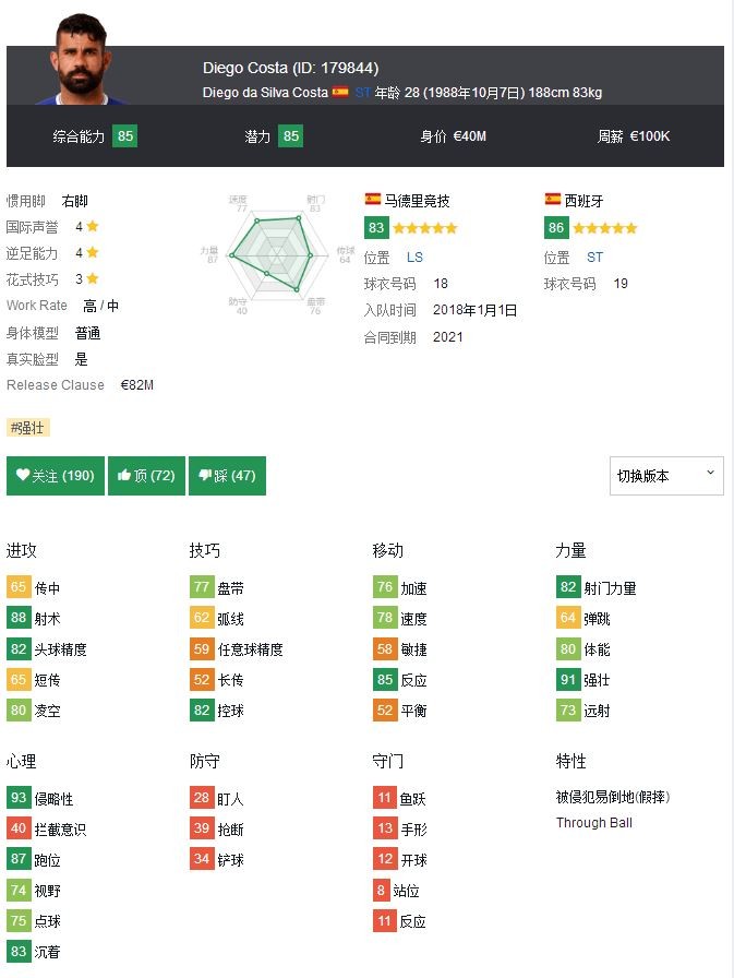 现年29岁的科斯塔,有着超高的91点的强壮,能够很好的适应各种身体对抗。此外76、78点的双速和80点的体能也证明了球员出众的运动能力。拥有93点侵略性和87点跑位的科斯塔进攻意识相当强,而且极富冲击力。即使技术欠佳,但凭着高达88点的精湛射术和82点的头球能力,科斯塔依然是众多后卫的噩梦。