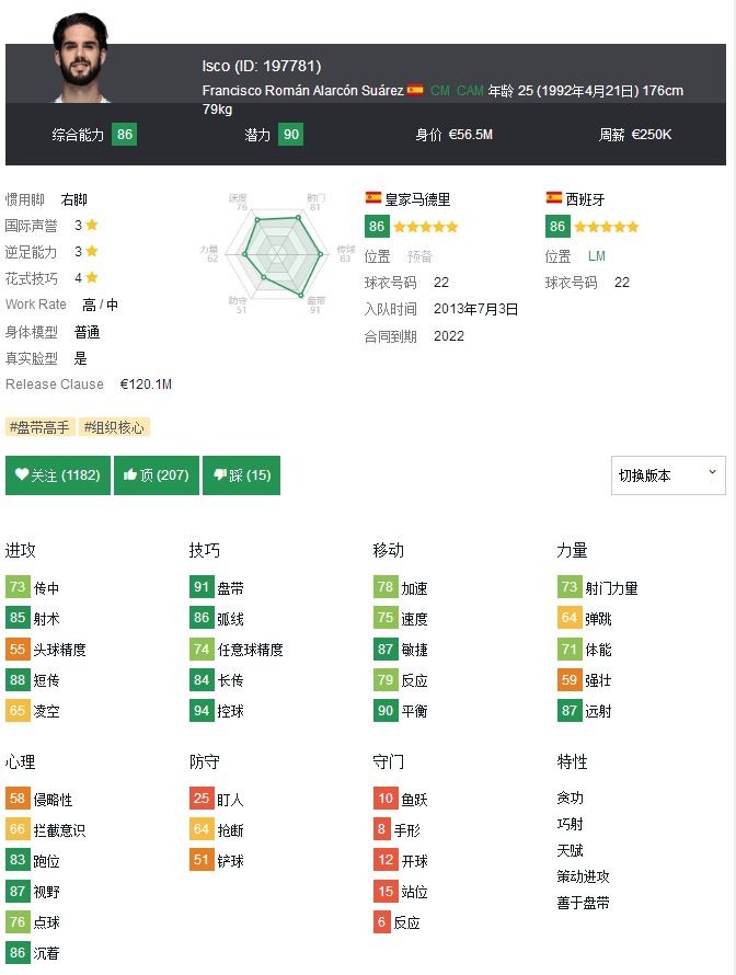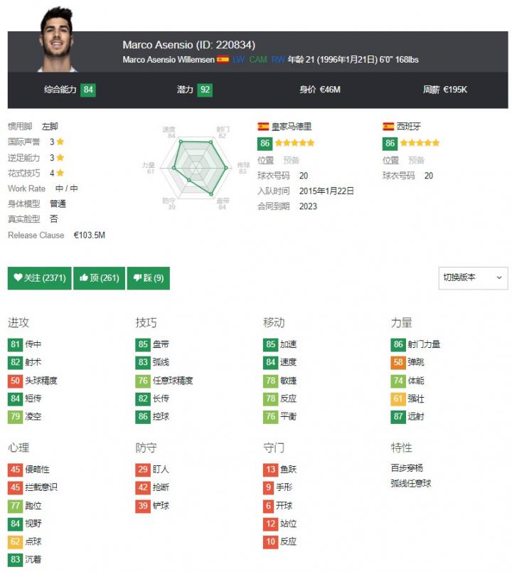 阿森西奥目前的总评有84点,但潜力却高达92点,可见游戏也对其伯纳乌王储的身份相当看重。球员82点的射术、83点的弧线、86、87点的射门力量和远射是最突出的能力。85、86的盘控技术搭配上85、84点的双速也让球员有着一定的盘带和突破能力,这种提速将会是西班牙阵中必不可少的“X因素”。