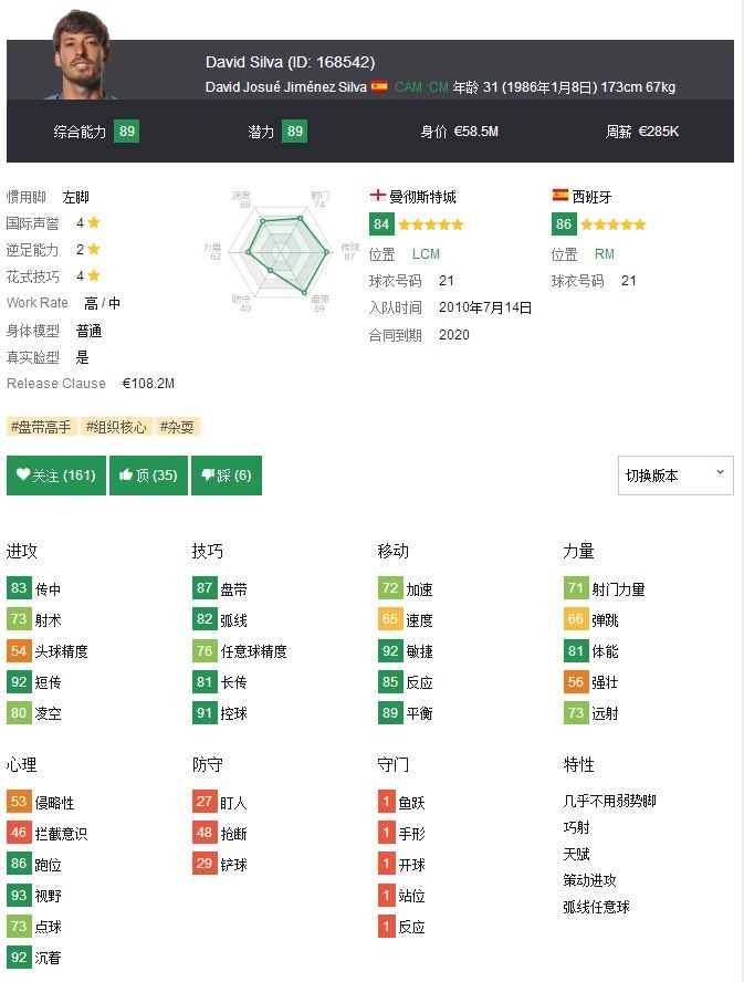 席尔瓦不仅技术突出、而且同样低身高的特点也让他的敏捷和平衡达到了92点、89点。但同样是矮个子,他与伊斯科的球风却不尽相同,大卫-席尔瓦喜欢持球后的调度组织和传球进攻,而不是拿球突破,这是更倾向于核心位置的踢法,从他92点的短传、93点的视野便可见一斑。不仅如此,大卫-席尔瓦的传球也常常能在出其不意间造成相当大的威胁。