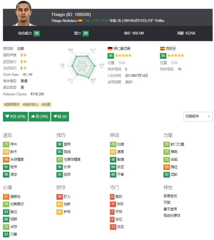 蒂亚戈在防守端还有着65、64点的铲抢能力,可见其技术的全面性。90、92点的盘控技术和90点的敏捷使得蒂亚戈的盘带能力丝毫不逊色队内的其他球员,91、90点的长短传和86点的视野也赋予了球员很强的组织调度能力。如此全能的能力用万金油来形容着实不妥,也许中场多面手是对蒂亚戈最好的定义。