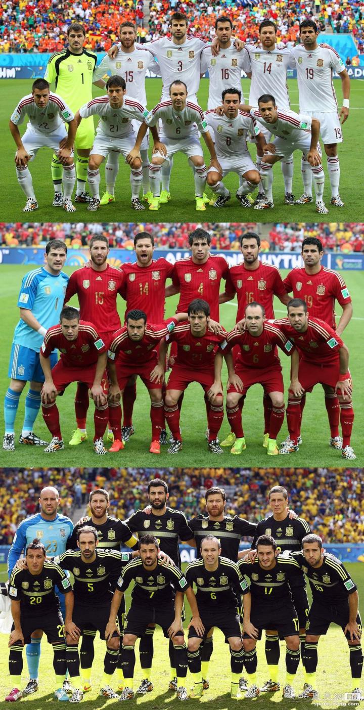 ↑西班牙队在本届赛事的球衣搭配为主红客黑,但因与小组第一个对手荷兰队的主客场球衣颜色在黑白电视机画面中均非常接近,所以在那场比赛特地身穿白色第二客场比赛服。最终他们一胜两负进4球丢7球惨遭淘汰,但三场小组比赛身穿三款不同颜色的球衣出战,这在世界杯及各大洲际比赛中也是空前绝后。