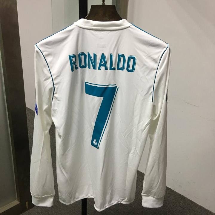 今天球衣大王带来欧冠决战皇马7号C罗的长袖球迷版球衣实物实拍,由于决赛两支队伍皇马与利物浦主场球衣颜色一白一红不冲突,所以决赛两队都可以穿主场球衣,但按抽签位置皇马是主队。而上赛季的欧冠决战签位是尤文主队黑白间条,所以皇马只能穿紫色客场。