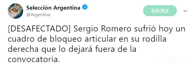 罗梅罗一直是阿根廷的主力门将,他曾在此前对阵西班牙的友谊赛中伤退,赛后他被诊断为右侧膝盖创伤。而在阿根廷国家队官方推特发出的最新消息中得知,罗梅罗同样是因为右侧膝盖的伤势而退出了本届世界杯。