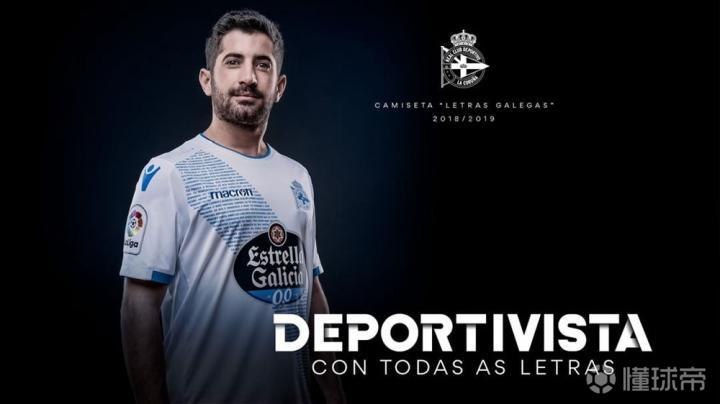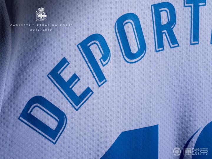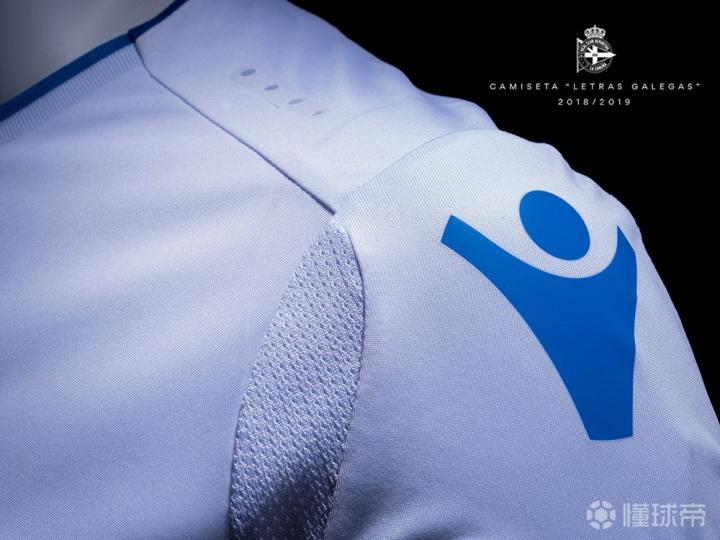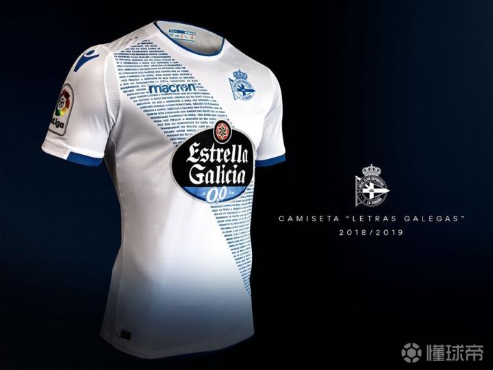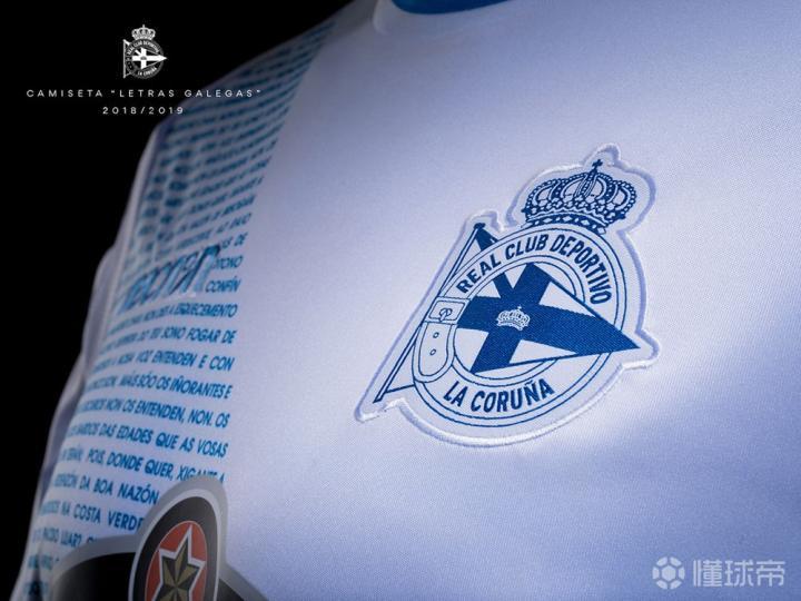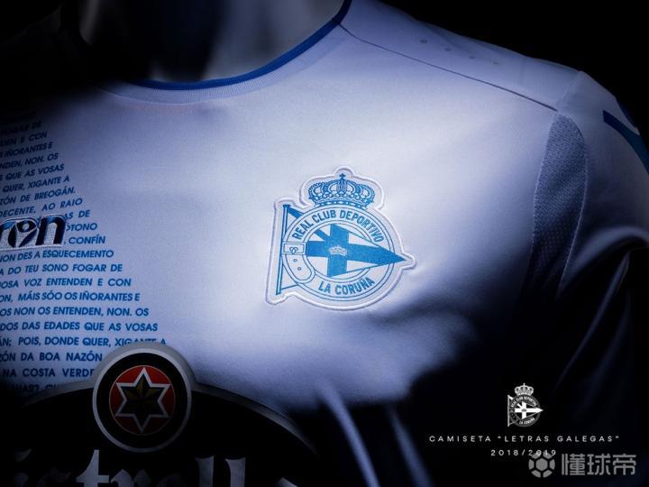 拉科鲁尼亚2018/19赛季第二客场球衣以白色为基调,球衣正面加入一条斜向天蓝色绶带,绶带由赞美加利西亚的诗歌组成,散发出浓郁的的地域风情。