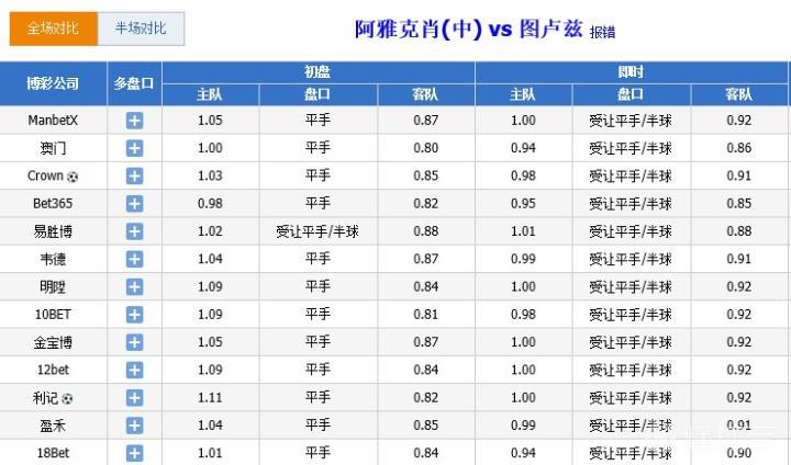 这场比赛亚盘多数以平手开盘,作为低一级别的球队,阿雅克肖的实力得到肯定,不过初盘水位仍是图卢兹较低,机构把客队视为上盘。截止北京时间23日下午3点,大多数机构都把盘口变成图卢兹让平半,水位小幅上涨,可以看出,图卢兹得到较多人的青睐,吸引了较多人投注,而且配合阿雅克肖主场优势被剥脱的题材,图卢兹的热度估计会进一步提高。
