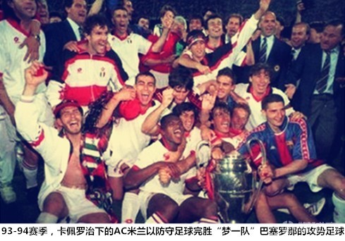 93-94赛季,AC米兰成功夺取意甲冠军,但“红黑军团”仅仅在联赛中打进36球,卡佩罗治下的米兰成为了彼时防守足球的代名词。而当时号称“梦一队”的巴塞罗那则在教父克鲁伊夫的率领下在当赛季联赛和欧冠中疯狂打进117球。因此,这场欧冠决赛也被冠以矛与盾之争的噱头。