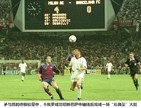 然而,卡佩罗却用自己的防守哲学在决赛中痛击强大的“梦一队”,克鲁伊夫也为自己的自负付出了代价。是役,卡佩罗利用德塞利在中场的缠斗能力成功切断了巴萨中场三名虎将之间的联系,并且在巴萨中前场建立防守阵地,成功孤立了巴萨王牌武器罗马里奥与斯托伊奇科夫。如此战术下,米兰不但成功限制了巴萨几近完美的进攻体系,还在上半时比赛中凭借马萨罗的梅开二度取得领先。