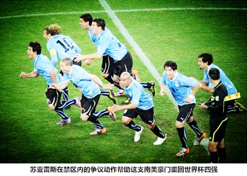 于是,戏剧性的画面随之出现了。加时赛最后时刻,乌拉圭射手苏亚雷斯在门线前用一个标准的排球拦网动作将加纳球员阿迪亚的必进球挡出,主裁判也对其直接出示红牌,加纳队获得点球良机。然而,有机会杀死比赛的吉安却将皮球重重的打在横梁上弹出,吉安沮丧的表情背后则是苏亚雷斯在场边的激情庆祝。