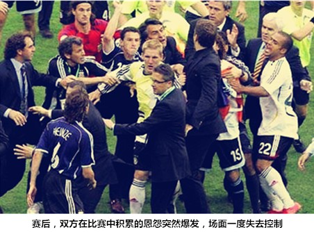 点球大战中德国人四罚全中,而莱曼先后扑出了阿亚拉和坎比亚索罚出的点球,德国人再次在点球大战中笑到了最后。但双方在场上长达120分钟的 积怨还是在赛后爆发了,在现场72000名观众的注视下,双方发生大规模冲突,场面一度失去控制。但这样的冲突对已经取得晋级的德国人却是残酷的,德国后腰弗林斯被禁赛两场,这也被看作是德国最后在半决赛失利的重要原因之一。