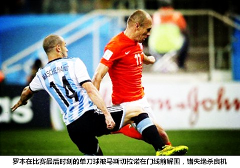 下半时比赛,梅西和伊瓜因先后获得破门良机,但均被边裁举旗示意越位,比赛场面也逐渐陷入胶着。常规时间最后时刻,库伊特送出秒传,罗本单刀杀入禁区面对罗梅罗小角度攻门,但马斯切拉诺奋勇回追将皮球在门线前解围,荷兰队错失绝杀良机,双方90分钟内互交白卷。加时赛中,阿根廷队同样拥有绝杀机会,但帕拉西奥的头球被西莱森扑出,双方不得不面对点球大战的考验。