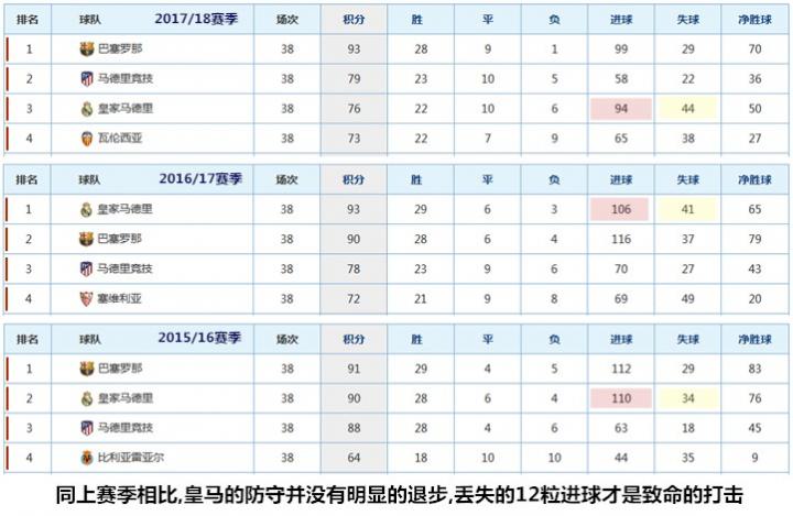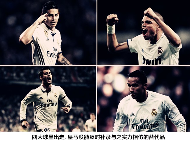 莫拉塔和J罗在上赛季总共参与了39粒进球(27球12助攻),这个数据占到了全队双线总进球数的28%,这是一个巨大的且难以弥补的亏空。齐达内原本希望可以集众人之力填补漏洞,然而,C罗在接受轮换的情况能够保持着上赛季的得分率已经殊为不易,本泽马的进球数更是创职业生涯新低,贝尔和马约拉尔效率不俗但出勤率无法保证,包括伊斯科、阿森西奥在内的后排球员也都还没有单季进球20+的经历。在防线不断遭遇伤病侵袭的情况下,指望球队防守能力的提升来创造更多的净胜球看起来也不实际。