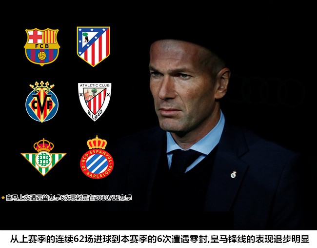 先后在皇家贝蒂斯、马德里竞技、巴塞罗那、比利亚雷亚尔、毕尔巴鄂和西班牙人身上收获白卷,皇马自穆里尼奥时代元年以来再次遭遇赛季6场零封。38场打进93球的成绩比上赛季(38场106球)下滑明显,尽管齐达内在赛季开打前对中前配角团寄予厚望,但他们终究没能弥补莫拉塔和J罗离队留下的40球亏空。场均丢1球是皇马多年来在联赛中惯有的防守水平,无法比对手进更多的球才是影响他们最终战绩的关键因素。
