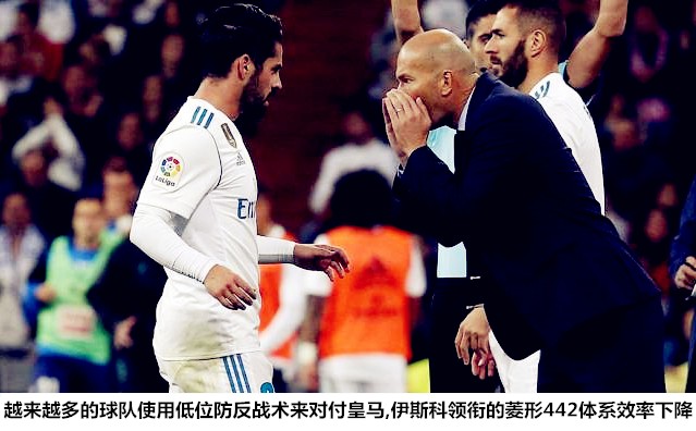皇马锋线效率急速下滑是由多方面原因造成的:首先,年过而立的C罗和本泽马的确已经到了前锋的快速下行区间,这种衰退几乎是不可逆转的;其次,贝尔在连续受伤后已经失去了阵地战强攻边路的能力,他即便出现在两翼也不是边锋,而是“站在边路的前锋”,威尔士人在典礼阵容之外的体系中很难和本泽马和C罗同时出场;再次,就是齐达内执意推进控球战术,放大了技术型中场与冲击型锋卫混搭形成的排斥反应。越来越多的球队在熟悉菱形442运转规律之后,开始有意识地放弃中场争夺,集中力量密闭低位空间压缩双前锋的冲刺空间,很多皇马球员都存在着处理球拖沓的习惯,这种不成熟的小球打法很容易陷入有“控”无“传”的低效模式。