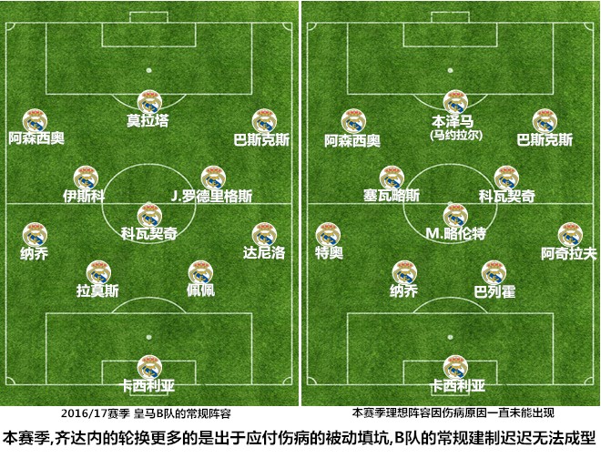 就像史上那些著名的王朝球队一样,皇马也在经历一个核心中轴老化但俱乐部依然在竭力压榨他们的剩余价值的阶段。成功卫冕欧冠似乎还不足以让高层下定决心拆散BBC,本泽马与C罗的捆绑效应让他看起来地位稳固,贝尔的年龄和“王储”身份让他总能得到主席的庇护。齐达内从上赛季就开始在A队的比赛中试验“跑锋”打法(首回合马德里德比),在B队的比赛中试验前腰与中锋的串联战术(4141阵型中),C罗也在第五次转型中找到了属于自己的节奏,这些都在无形中延缓了皇马锋线更新换代的速度。