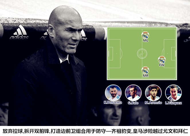 或许正是因为了解自身短板,齐达内在同其他顶级教练对弈时往往不会按部就班地出招,他从刚刚接手皇马时就养成了强强对话剑走偏锋的习惯。从去季欧冠决赛时主动放弃控球到本赛季前期使用酷似无锋阵的4411征战卡尔德隆,从两回合对阵拜仁时的菱形442进攻阵型到次回合国家德比冒险遣上贝尔与巴萨展开对攻,强弱交锋时险情不断的皇马总能在与同级别对手交锋时交出令人满意的答卷。然而,以本赛季首回合国家德比惨败为标志,齐达内“战略阴谋家”的光环也不复存在,核心球员不可逆的衰退和阵容深度的大幅度消减让他失去了求变的底牌,其在精细操作方面的不足很快暴露了出来。