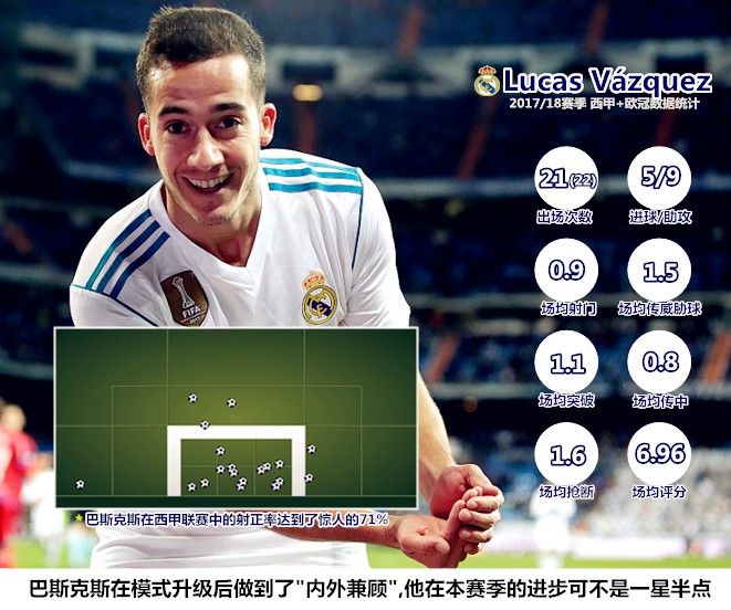 两名边前卫在无球状态喜爱戍守两翼,在有球状态下切换到“内线化”打法,此举兼顾了平行442和菱形中场的优点。边路传中一直是皇马最为可靠的进攻手段,但在BBC无法合体的情况下,两翼传中的效率并不高,皇马必须要增加中路进攻的比重来拓宽进攻支援渠道。功能型球员巴斯克斯完成进化,意味着皇马的前场球员基本都具备了跨区域作战的能力。