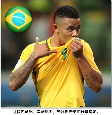 国籍:巴西,所属俱乐部:曼城,1997年4月3日出生,年龄21岁。本赛季热苏斯在前锋顺位上将超级前锋阿圭罗牢牢压制,这也彰显了这个年轻人的不凡实力,而跑位机敏、表现稳定的热苏斯也深得瓜迪奥拉的喜爱。在这届世界杯上,人们都把他当成内马尔的最得力助手!而巴西经历了上届世界杯的惨淡之后,在率领球队重返巅峰的愿景上,热苏斯被寄予了殷切期望。