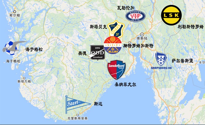 挪威第一大城市周边的7支球队,放大一点看,这些球队的位置是这样的。