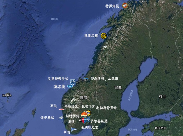 挪威的首都是奥斯陆,挪威第一大城市,也是周边球队最多的城市。从2018赛季挪威超地图中我们可以发现,挪威貌似比瑞典更“怕冷”,俱乐部都扎堆集中在南部,北部只有两支球队——特罗姆瑟和博德闪耀。