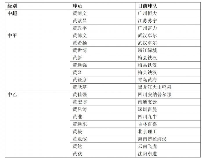 (目前在中超联赛仅有3名黄姓球员,在中甲有8名黄姓球员,在中乙有9名黄姓球员)
