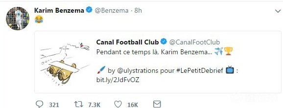 本泽马转发了这张漫画,并附上了一个笑哭的表情。此中心情,大家就自行体会吧!