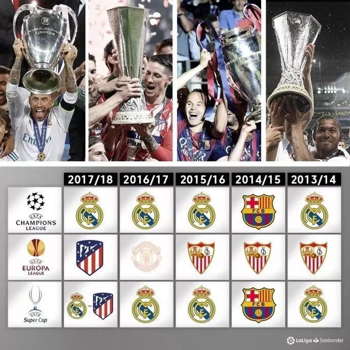 窥一斑可见全豹,今年马德里双雄会师欧洲超级杯只是西甲球队在欧洲赛场上强势的一个缩影,我们把时间轴拉长到五年,在这个更广的时间维度上我们可以看出:五年间的欧冠、欧联十座冠军奖杯,居然被西甲球队带回伊比利亚半岛了九座!唯一的例外是上赛季“曲线救国”靠欧联杯夺冠重返欧冠的曼联队。西甲球队最近五年几乎拿到了欧洲俱乐部赛事的所有冠军,就像给欧洲气候带来极大影响的盛行西风一样每年都如期而至,并且势不可挡。