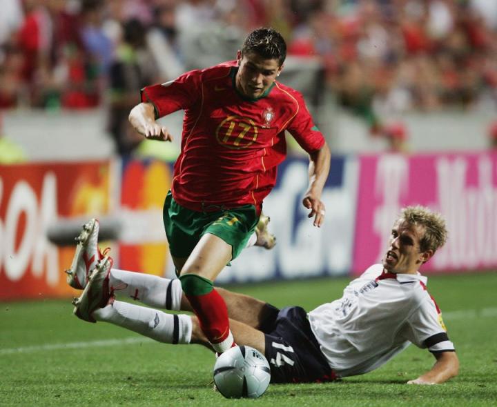 C罗再次出现在攻击线的左路,和他搭档的有创造力十足的德科和经验丰富的队长菲戈。C罗和他的队友们有信心给英格兰的防线制造麻烦,而事实上他们也做到了。不过直到比赛进行到第83分钟,东道主才由波斯蒂加扳平比分。加时赛中,鲁伊-科斯塔的远射帮助葡萄牙反超比分,但此后兰帕德为英格兰顽强地扳平比分。此后双方再无建树,只能通过残酷的点球大战决出胜负。