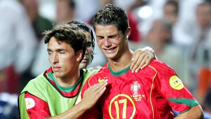 那一刻你甚至听不到葡萄牙人的声音,你能听到的只有希腊人响彻全欧洲的激动的歌声。那个时候的C罗只能带着被眼泪模糊的目光看着希腊捧起欧洲杯的冠军奖杯,这是他职业生涯里输掉的第一场决赛。不过最终C罗还是入选了那届欧洲杯的最佳阵容,这对他也算是种安慰了。