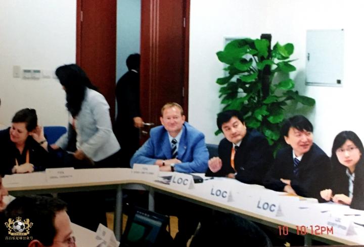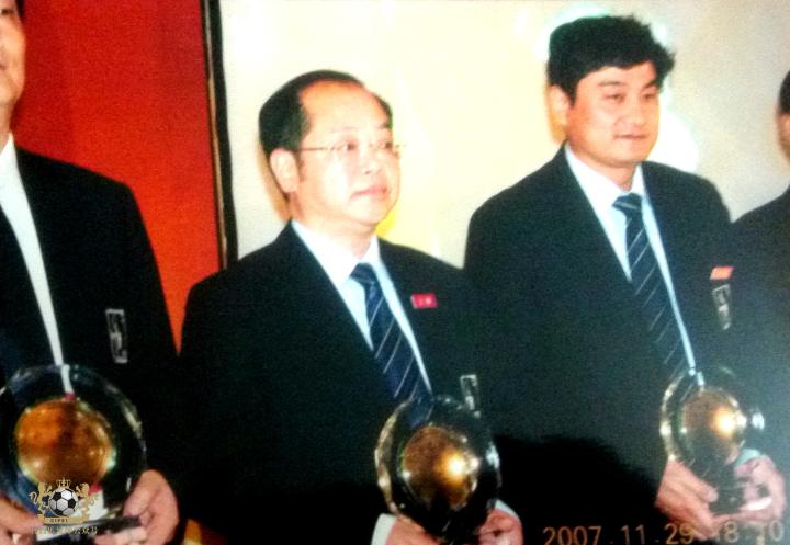 与前中国足协副主席薛立(右一)、外事部王彬(左一)合影