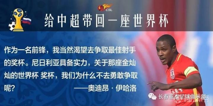世界杯前,《亚泰视觉》联合体坛+对即将开启世界杯征程的伊哈洛进行了专访,伊哈洛坦言,不仅要为祖国尼日利亚而战,同样要为亚泰和中国球迷而战。“作为一名前锋队员,我当然渴望去争取最佳射手的奖杯。至于金灿灿的世界杯奖杯,我认为尼日利亚是具备实力的,前方就是梦想的竞技场,我们为什么不去勇敢争取呢?”