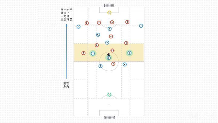在同一条水平线上不超过3名球员的原则意味着球员必须不断地观察并审视他们的位置,以创造出斜向的传球选择或在球后进行支持,从而使球队在平衡和保护下稳步向前推进。