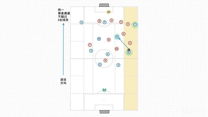 由于边线可以充当一名后卫,直传球也会被拦截,因此瓜迪奥拉要求在同一垂直的通道里不超过2名球员。在上述场景中,2名球员(沃克–蓝色2号和斯特林–蓝色7号)在同一垂直通道,吸引了对方11号、3号、6号和5号4名球员。