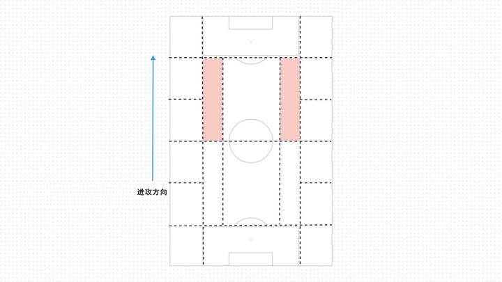 场地被划分为4个纵向通道和5个横向通道,瓜迪奥拉在运用这些通道时的原则是和通道一致利用位置或人数优势创造球旁向前的传球选择,或者开发弱侧空间和内部通道。