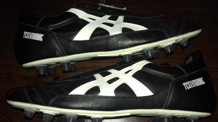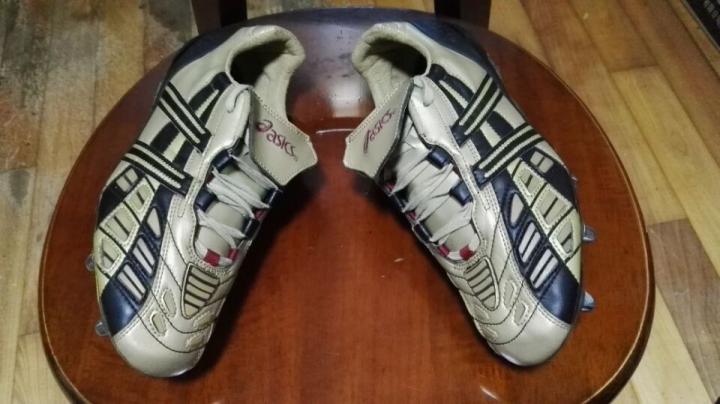 另一个日本品牌asics在2002年发布的第一代tigreor,我之前介绍了,日本队的门将川口能活和后卫中田浩二使用这双鞋,除此之外,意大利队的内斯塔和科科还有迪利维奥也穿的这双金色的asics足球鞋,当然最有名的还是阿根廷的贝隆。这双鞋的鞋面设计非常霸气,嵌入式摩擦条和猎鹰有些类似。