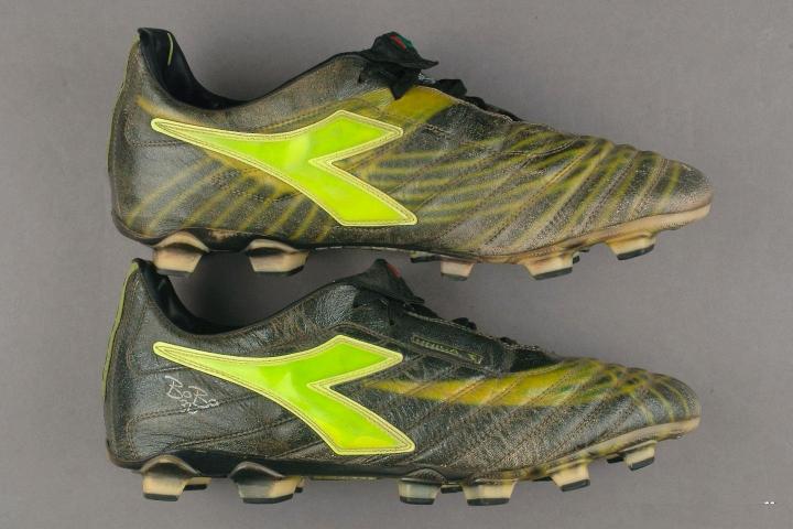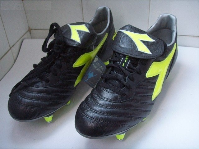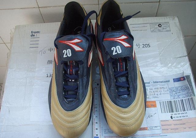 下面来看diadora,diadora在2002年世界杯上推出的足球鞋还是一如既往的款式多,最常见的毫无疑问是brasil的黑黄经典配色,阿根廷铁闸萨穆埃尔,爱尔兰边后卫哈特,丹麦队的延森和约根森等,这款鞋是和之前比鞋舌成了圆弧形边缘,内衬也改成了银色。袋鼠皮的质感还是其强项,细腻无比。