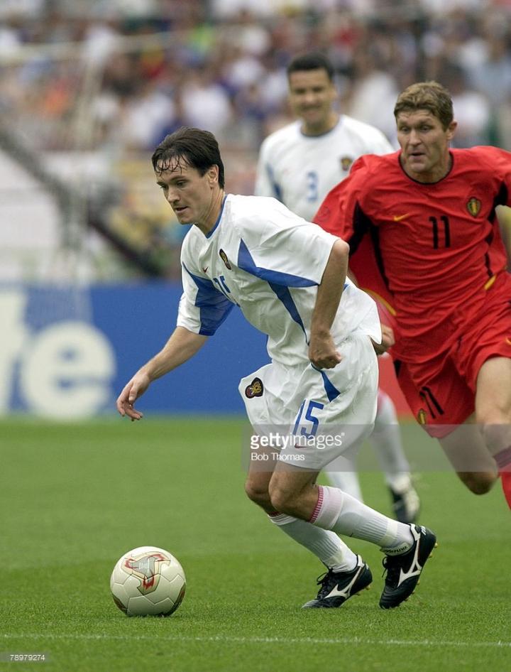 下面两位俄罗斯球员使用的则是老款的morelia jp,这款鞋的鞋舌背面是黑色白字。1998年里瓦尔多使用的就是这款鞋。