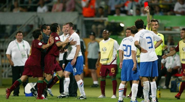 比赛开始后短短2分钟,范博梅尔就因为铲倒C罗吃到黄牌,而那也是全场比赛16张黄牌中的第一张。是役共4名球员被罚下,他们分别是科斯蒂尼亚、德科、布拉鲁兹和范布隆克霍斯特,还有几名犯规动作很大的球员逃过一劫,例如菲戈在比赛中曾头顶范博梅尔。