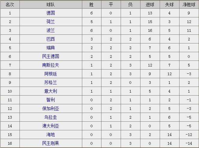 1974年德国世界杯各国家队排名