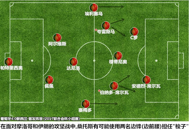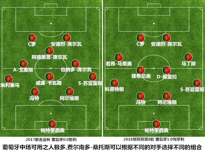 老帅费尔南多-桑托斯是玩转人员排列组合的高手,其在欧洲杯期间靠着“轮换”边后卫和菱钻梭子来针对不同的对手。彼时的葡军中场可谓是对抗能力有余但创造力略逊,这也是球队一路平局进入半决赛的原因。从2017联合会杯开始,他在赛前的主要工作变成了在边锋和技术型中场之间进行取舍。