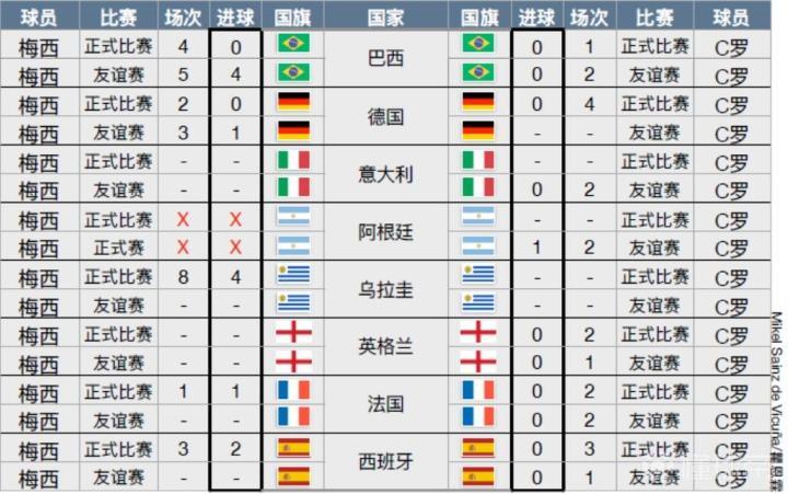 那么问题来了:这两位过去十年世界上最好的球员,对阵曾经的世界杯冠军球队,战绩如何呢?分析过后我们得出一个令人惊诧的结论:首先我们要知道他们为国家队的进球远不如俱乐部,而梅西的国家队战绩更好。在对阵世界杯冠军球队的比赛中,C罗的战绩不如梅西。