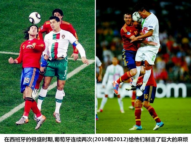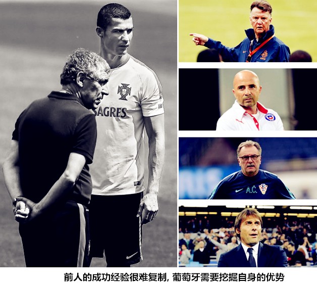 西班牙在近两届大赛中遭遇四场失利,先后击败他们的四支球队中的三支(荷兰、智利和意大利)均无缘本次世界杯。考虑到西班牙与克罗地亚人在淘汰赛阶段遭遇的可能性不大,斗牛士军团似乎应该为克星们的集体消失而欢呼。葡萄牙不能像荷兰那样依靠犀利的锋线瞬间将战火燃烧到对手禁区,不能像智利那样打出令人窒息的高位压迫和逼抢,也不能像意大利那样凭借高中锋简化反击推进、掩护中场突击,葡萄牙不能照搬照抄前人的经验,他们需要发掘自身独特的优势。桑托斯在赛前高调宣称要“要从西班牙脚下抢球”,说明他已经将决斗的主战场圈定在了中场区域。