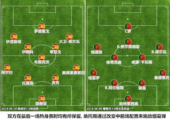 葡萄牙在6月8日完成了最后一场战前热身,西班牙也在两天后正式进入了世界杯时间,两支球队都在赛前进行了全封闭训练。经过充分休息后的球员们可能会在开场阶段变得如狼似虎,也有可能意外失去节奏而对比赛的感觉变得迟钝。如何在大战之前调动球员们的专注力和积极性是一门学问,大赛经验相对欠缺的洛佩特吉在最后一场热身赛中使用了除迭戈-科斯塔以外的全部主力,他希望利用这种方式让球员们提前进入世界杯节奏,见多识广的费尔南多-桑托斯显得处变不惊,他在最后一场热身赛中依然不忘用练兵的方式释放烟幕弹。