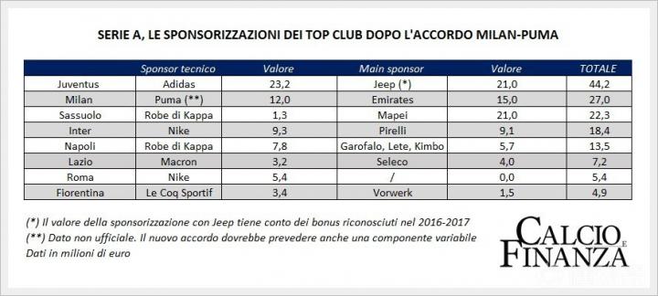 图为倍耐力续约和目前意甲前八的队服和胸前广告赞助金额