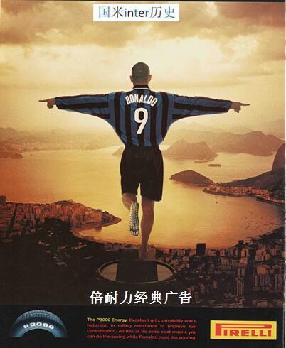 倍耐力最经典的广告是1998年的,以风景优美的里约热内卢全景为背景,世界足球先生罗纳尔多双臂张开。这张照片是英国摄影师Ken Griffiths拍摄的,在这张引人入胜的照片里,罗那尔多通过他传奇色彩的脚,展现了强有力的视觉冲击力和统治权威,在那瞬间里表达了倍耐力轮胎的内涵。这个广告的标题是“Power Is Nothing Without Control”(没有控制就没有力量),展现了倍耐力轮胎的安全性和卓越性能。
