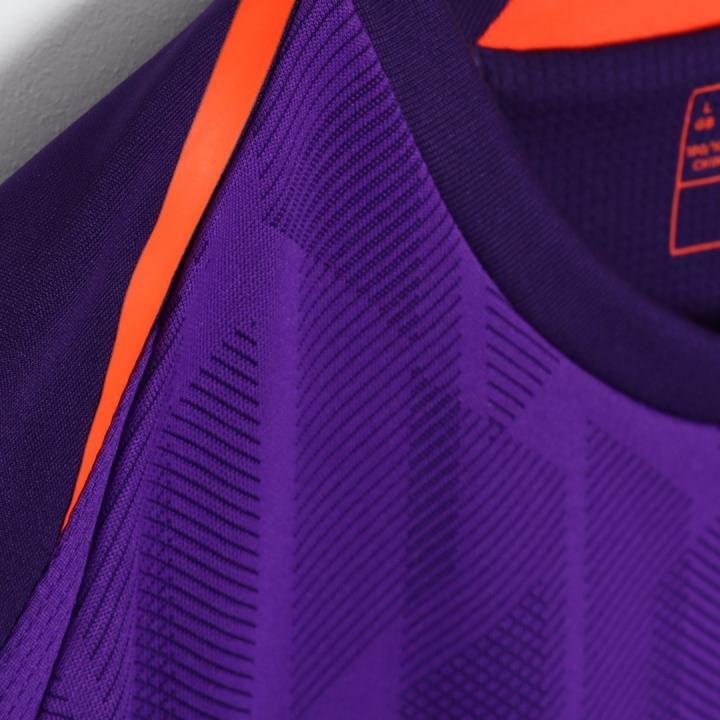 一个紫色罗纹圆领让客场球衣看起来更具休闲感,背后衣领下方依旧加入带有“96”字样的火焰标识,纪念希尔斯堡惨案中丧生的96名利物浦球迷。