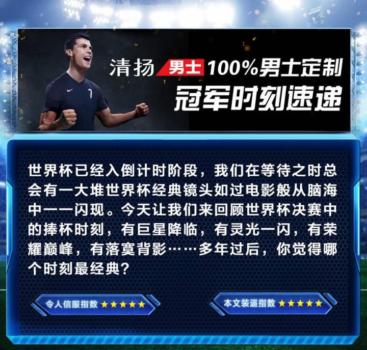 回顾了这么多,在你心目中,哪个冠军时刻最经典?而在本届世界杯中,你又期待谁最终登上世界杯决赛的舞台?是C罗梅西的再一次相遇,还是兵强马壮的高卢公鸡,是缺少了萨内的日耳曼战车,还是盼望着拥有超黄金一代的比利时能解决团结问题?