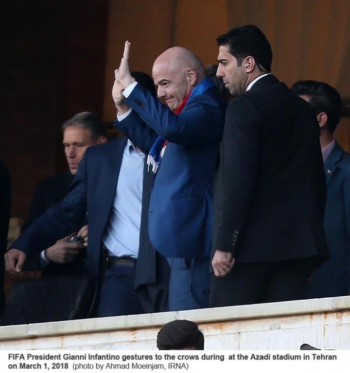 观察这场比赛的有一个特别的客人。在伊玛目霍梅尼和阿亚图拉-哈梅内伊的画像下,上下层看台之间悬挂着一个标语:“欢迎因凡蒂诺。”国际足联主席正在访问伊朗。因凡蒂诺此次的访问可能具有重要的政治意义,尽管现场有10万名观众,但由于球场的禁令,这里没有任何一名女性(官方统计)。两个月之前,另外一个禁止女性进入足球场的大国沙特阿拉伯已经宣布女性将被允许参与到比赛当中。