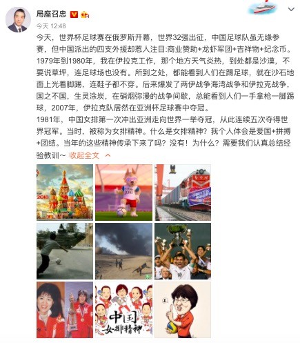 作为退役军人,张召忠曾经是我军著名高级将领,有过多年的海外工作学习经验,他回忆道:“1979年到1980年,我在伊拉克工作,那个地方天气炎热,到处都是沙漠,不要说草坪,连足球场也没有。所到之处,都能看到人们在踢足球,就在沙石地面上光着脚踢,连鞋子都不穿。后来爆发了两伊战争海湾战争和伊拉克战争,国之不国,生灵涂炭,在硝烟弥漫的战争间歇,总能看到人们一手拿枪一脚踢球,2007年,伊拉克队居然在亚洲杯足球赛中夺冠。”