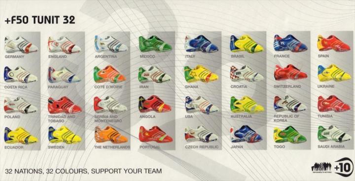 可能大家觉得,f50的鞋面差不多应该结束了,不不不,这只是开胃菜,正餐还没上呢,adidas在2006年世界杯上,发布的球队专属鞋面系列,覆盖32支球队,而且每个鞋面都有细节上的差别。还专门举办了发布会。这个可真是下了大本钱了,可以说史无前例。
